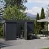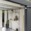 Compared to the ‘Modern’ Juno, the ‘Design’ Juno has side walls with ribbed sheet infill spacing of 48cm (compared to 24cm on the ‘Modern’). The standard version comes with a single door, however you can upgrade to a double door to allow wider access into the shed. All doors come with a gas spring for easy use of the doors. You also have the choice to add a single-pane safety glass window, or a floor-to-ceiling window!
