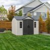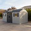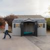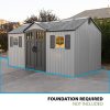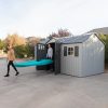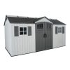 When you want to maximize your storage and organization while minimizing maintenance, look no further than the Lifetime 15-Foot x 8-Foot Outdoor Shed. As a premium shed, it has the internal space to store lawn mowers, bikes, tools, sports gear, and anything you need for good outdoor maintenance and fun. Organize your equipment your way using a customizable adjusting shelf system, and enjoy the convenience of the centralized doors, which offer easy and convenient access to the shed. Six skylights give natural light to the interior and the attractive design will look great in your yard and keep your space beautiful. The shed is designed for ease of use and low maintenance—a high-pitched roof allows for quick drainage of rain and snow, the UV protected material resists weather damage, and the impact- and slip-resistant high-density polyethylene floor protects against oil, solvents, stains, and damage from drops and dings. You can rely on your shed—it is made with a sturdy, steel-reinforced frame and Double Wall System construction for maximum durability and longevity. Secure your items with lockable latches and enjoy the convenience of easy and complete lawn and garden storage and organization with the Lifetime 15-Foot x 8-Foot Outdoor Shed.