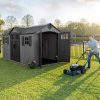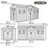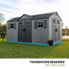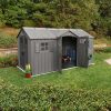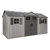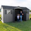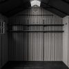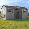 When you want to maximize your storage and organization while minimizing maintenance, look no further than the Lifetime Dual Entry 15-Foot x 8-Foot Outdoor Shed. As a premium shed, it has the internal space to store lawn mowers, bikes, tools, sports gear, and anything you need for good outdoor maintenance and fun. Organize your equipment your way using a customizable adjusting shelf system, and enjoy the convenience of two separate entry points, one on the end and one on the side of the shed, so no matter how you arrange your things, you’ll be able to access it in a way that’s convenient for you. Six skylights give natural light to the interior and the attractive design will look great in your yard and keep your space beautiful. The shed is designed for ease of use and low maintenance—a high-pitched roof allows for quick drainage of rain and snow, the UV protected material resists weather damage, and the impact- and slip-resistant high-density polyethylene floor protects against oil, solvents, stains, and damage from drops and dings. You can rely on your shed—it is made with a sturdy, steel-reinforced frame and Double Wall System construction for maximum durability and longevity. Secure your items with lockable latches and enjoy the convenience of easy and complete lawn and garden storage and organization with the Lifetime 15-Foot x 8-Foot Outdoor Shed.
