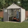 The Tremont Shed 8×7 by Suncast offers a robust and spacious garden storage solution that is ideal for all of your garden essentials such as lawn mowers, tools, and furniture – thanks to 11m³ of internal space. The included corner shelves provide even more practical storage to keep you neat and organised. Large lockable double doors provide quick and easy access to the structure and the built-in skylights flood the Tremont Shed 8×7 in natural light, making locating your items simple. Constructed from robust, long-lasting, metal reinforced multi-wall resin panels, this sturdy shed is weather resistant and low maintenance, upgrading your garden storage and keeping your outdoor essentials organised and secure year after year.